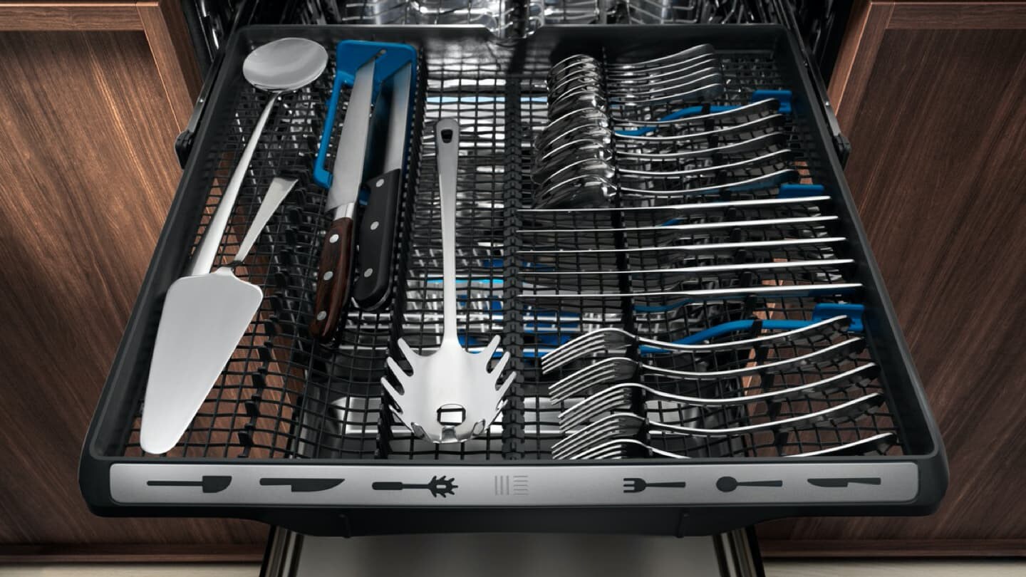 Ruokailuvälinetaso MaxiFlex – pesee helposti kaikenmalliset ja -kokoiset aterimet ja keittiövälineet.
