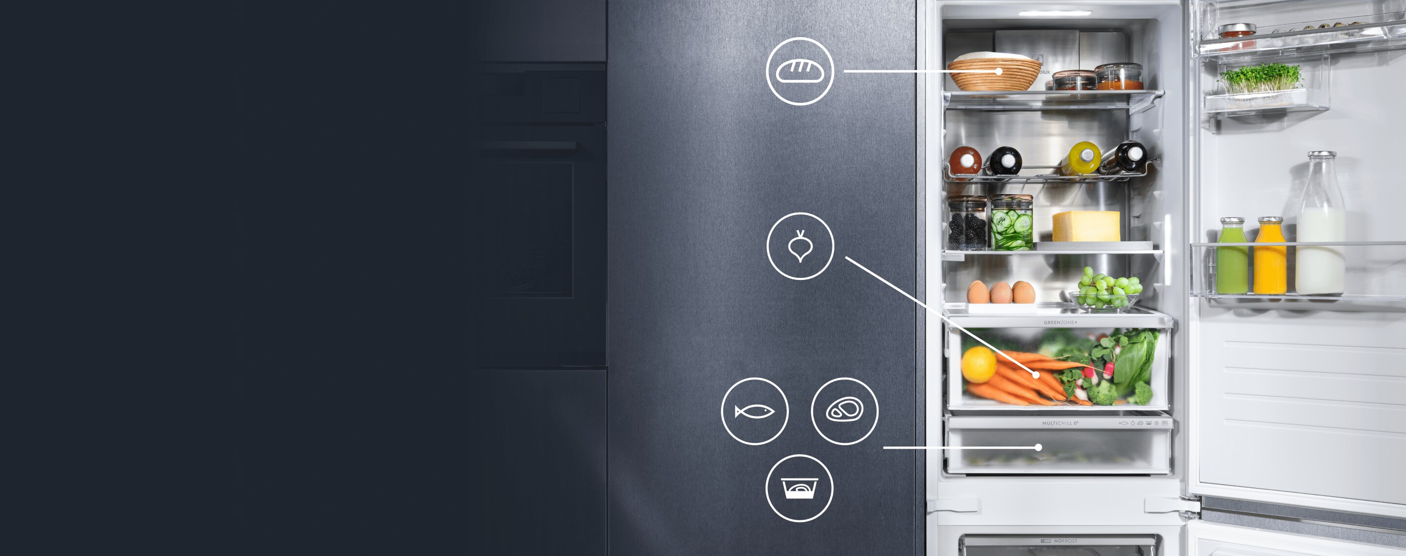 MultiChill 0°C -sovellus auttaa sinua raaka-aineiden valmistelussa, kun taas MultiChill- ja GreenZone+ -laatikot, joiden lämpötilaa ja kosteutta ohjataan toisistaan riippumatta, tarjoavat parhaan mahdollisen mukautetun ruoan säilytyksen.