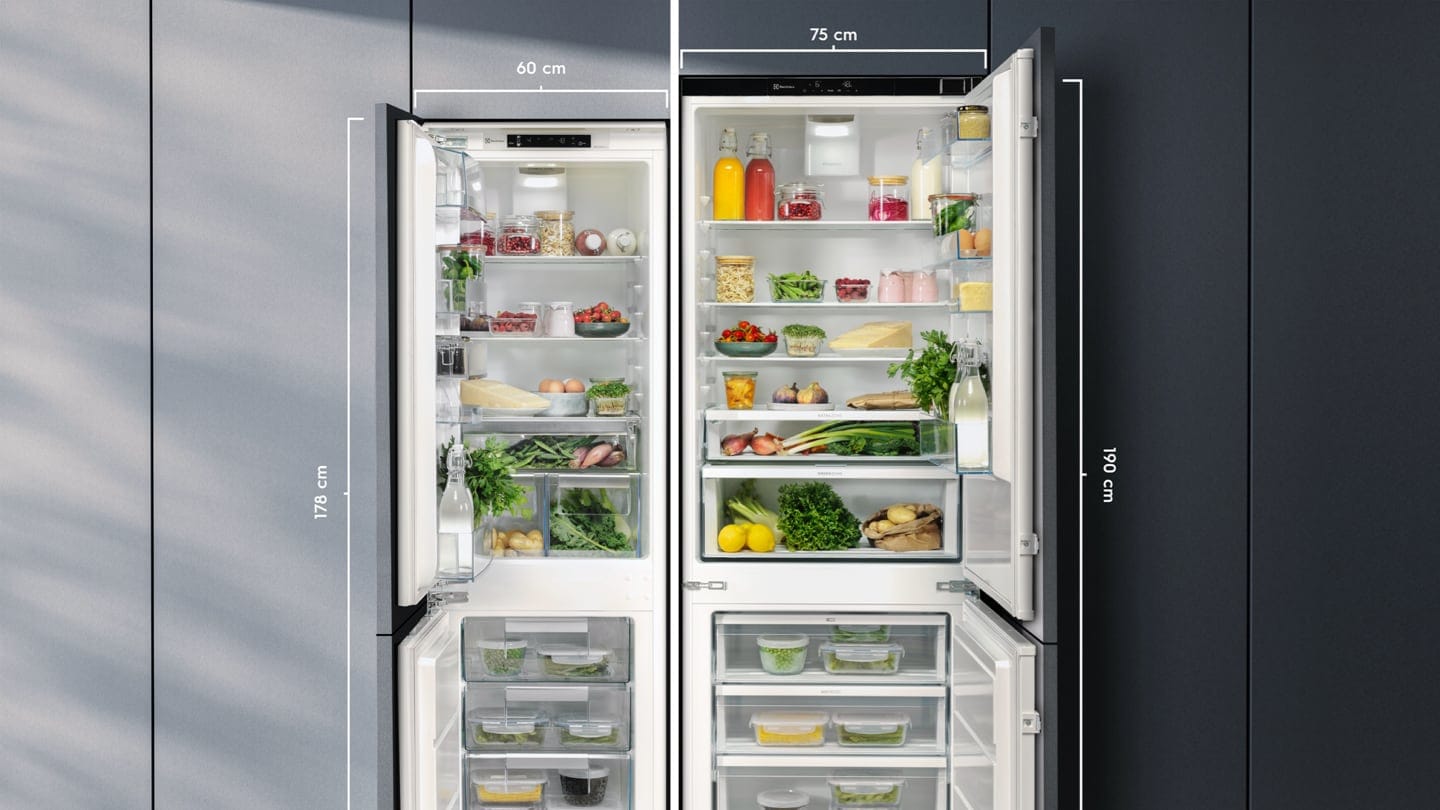 Integroitavat jääkaappipakastimemme valmistetaan yleensä vakiokokoisina, jotta ne mahtuvat keittiön kalusteoven taakse. Vapaasti sijoitettavien mallien mitat voivat vaihdella korkeuden ja leveyden mukaan. Electroluxin jääkaappipakastimet ovat 60–75 cm leveitä ja 190 cm korkeita. MaxiSpace jääkaappi ja pakastin antavat sinulle mm. 45 % enemmän kapasiteettia kuin integroitavat vakiomallit. Kaikki mitat löytyvät tuotesivuiltamme.