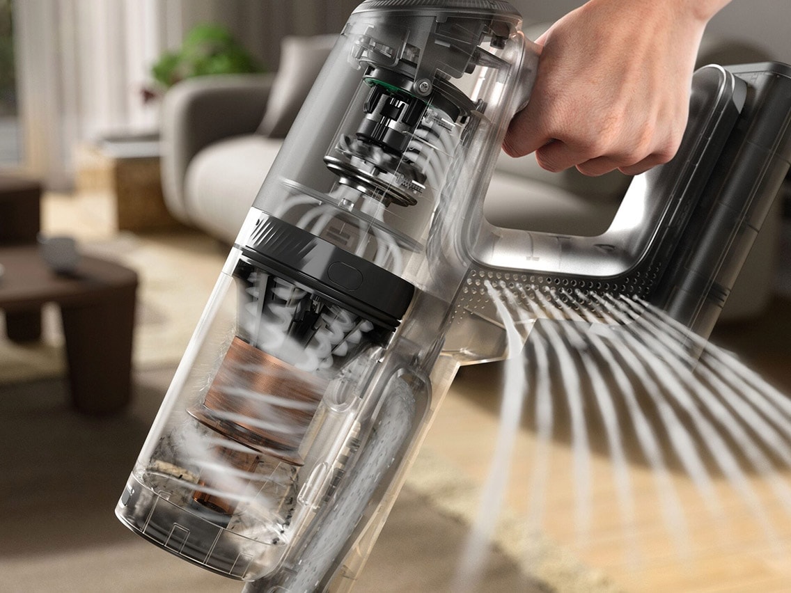 • Syklonijärjestelmä: Ilma kiertää suurella nopeudella ja erottelee pölyn ja roskat tehokkaasti imuvirrasta ennen kuin ilma suodatetaan.
