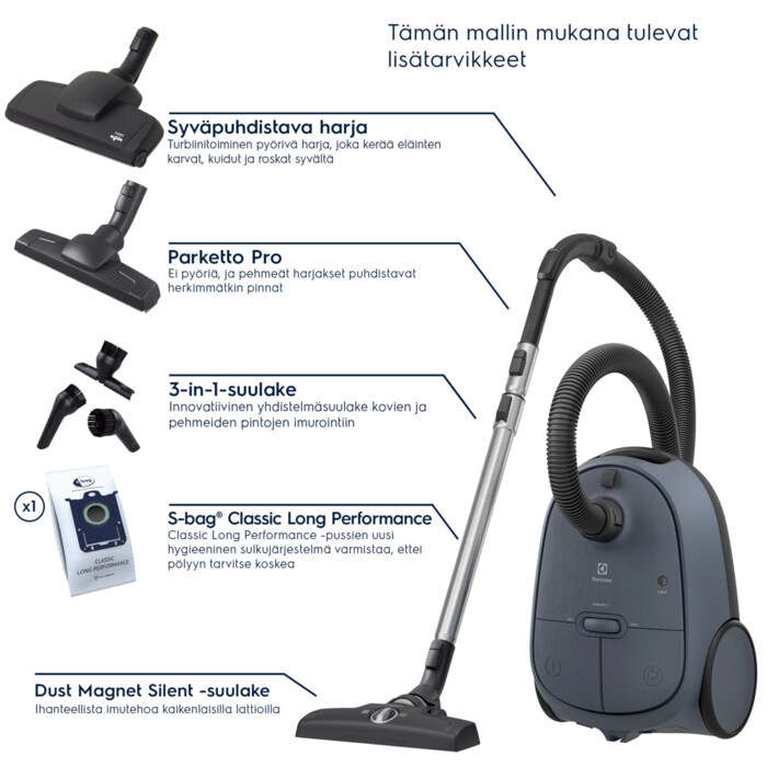 * Perustuu 0,3–10 mikrometrin kokoisten mikropölyhiukkasten suodatusta testaaviin standardin EN 60312-1 mukaisiin sisäisiin testeihin, joissa käytettiin standardinmukaisia hiekka-/pölyhiukkasia.