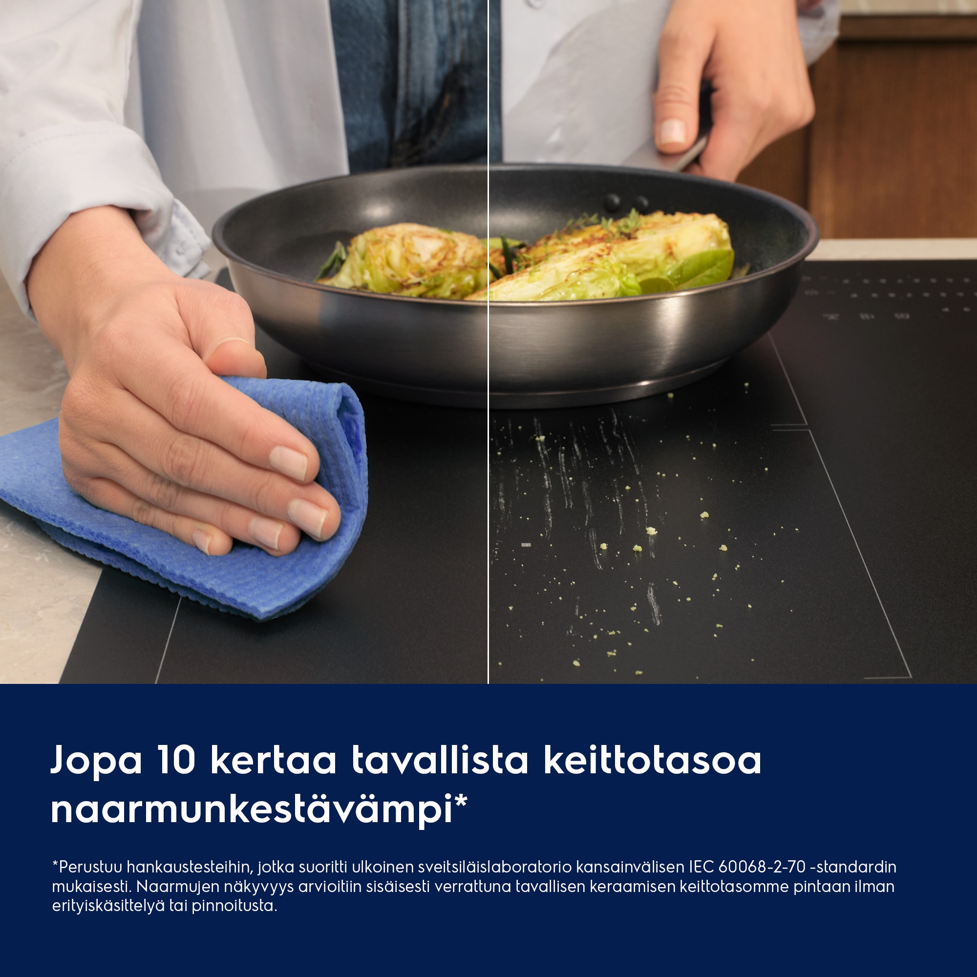 *Perustuu ulkopuolisen sveitsiläislaboratorion hankaustesteihin, jotka suoritettiin kansainvälisen IEC 60068-2-70-standardin mukaisesti. Naarmujen näkyvyys on arvioitu sisäisesti verrattuna normaaleihin keraamisiin keittotasoihimme ilman erityiskäsittelyä tai pinnoitusta.