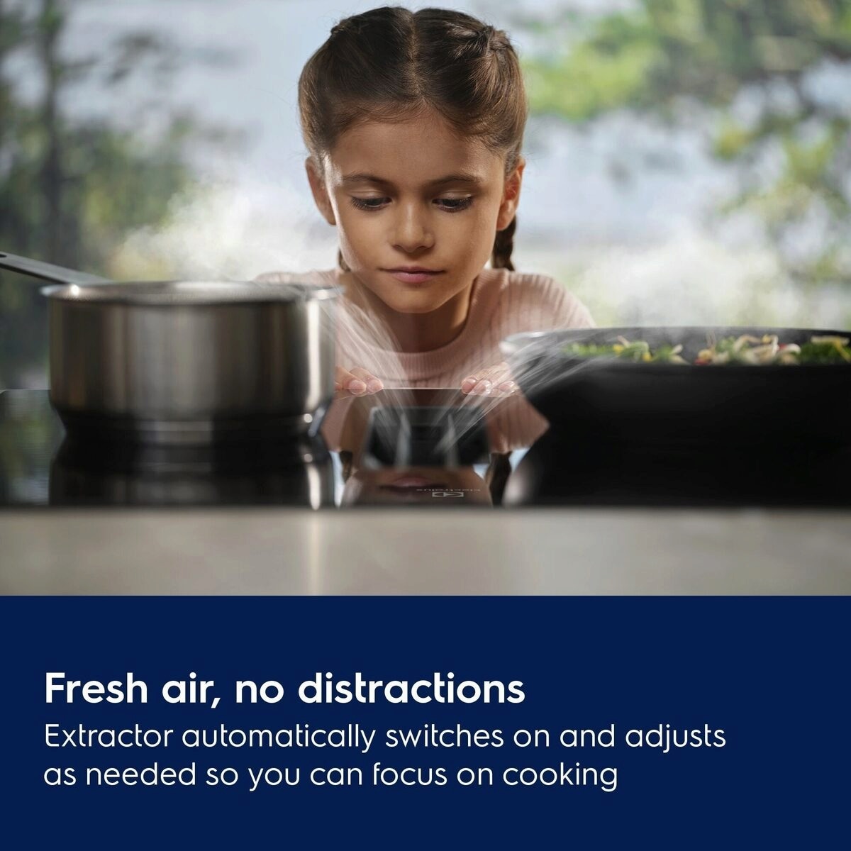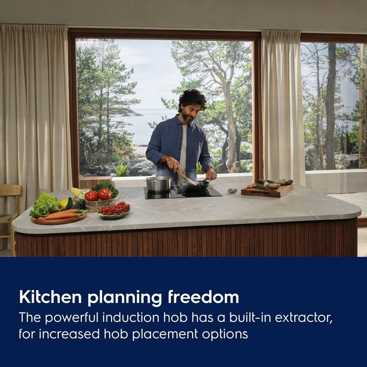 Induktiotaso, joka mahtuu 60 cm:n keittiökaappirunkoon ja tarjoaa ihanteellista tuuletusta sisäänrakennetulla liesituulettimella. Liesituulettimellinen 600 Bridge -keittotaso sisältää myös Bridge-toiminnon, jolla voit yhdistää kaksi keittoaluetta yhdeksi isommaksi alueeksi.