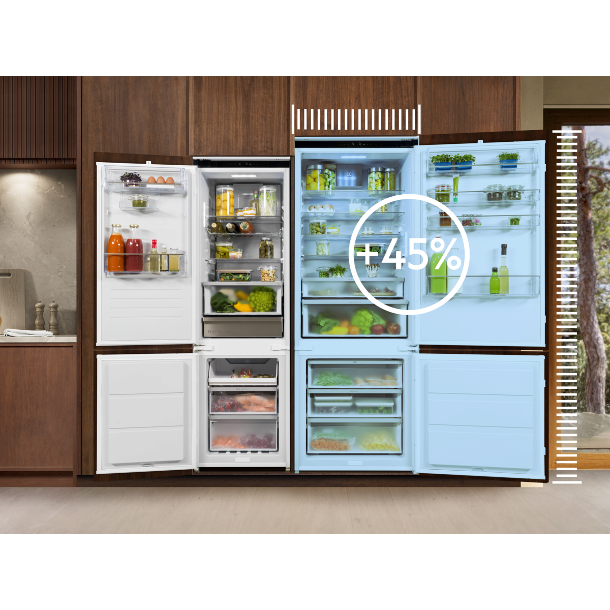 700 No Frost AI CoolAssist -jääkaappipakastin mukautuu päivittäisiin rutiineihisi, olitpa sitten purkamassa ruokaostoksia tai lähdössä lomalle. No Frost ehkäisee jään muodostumista, jotta pakastinta ei tarvitse sulattaa.