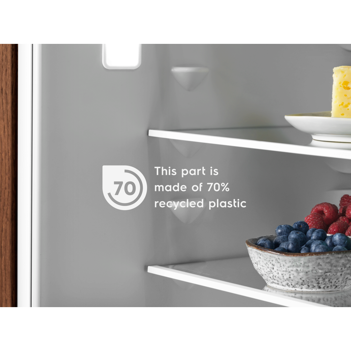 Jääkaapin sisäosat on valmistettu 70 % kierrätysmuovista.