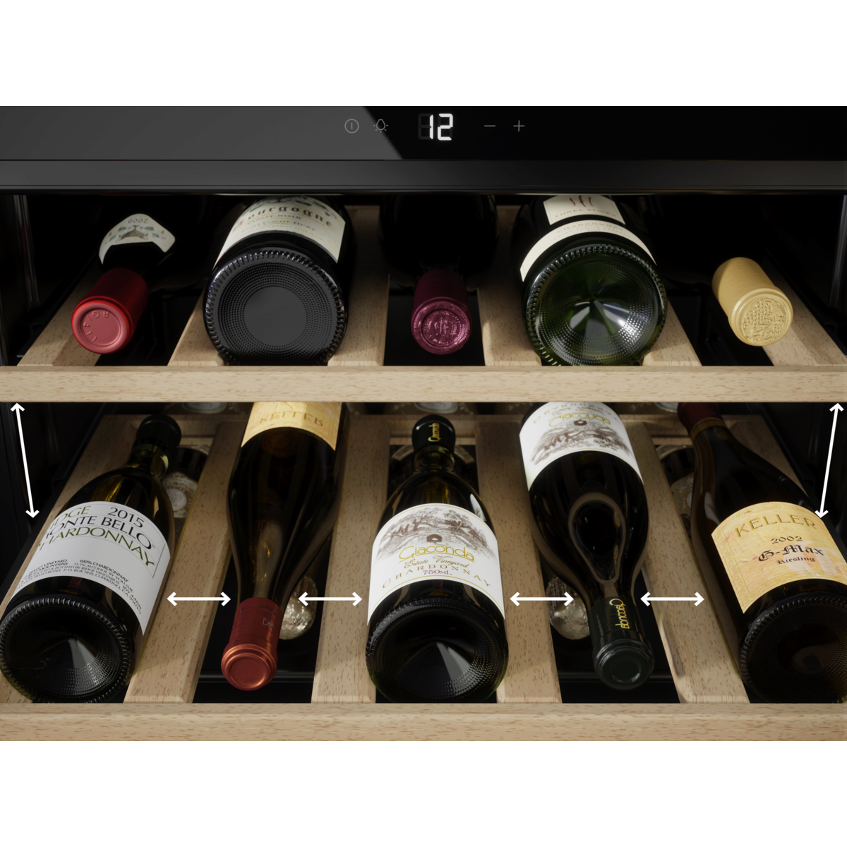 Perfect Shelving -hyllyissä viinikokoelmasi pääsee oikeuksiinsa. Leveät rimat, korkealaatuinen puu, teleskooppikiskot ja ihanteellinen välistys sopivat kaikenlaisille 750 ml:n pulloille – suosikkisamppanjasi mukaan lukien – etikettejä naarmuttamatta.