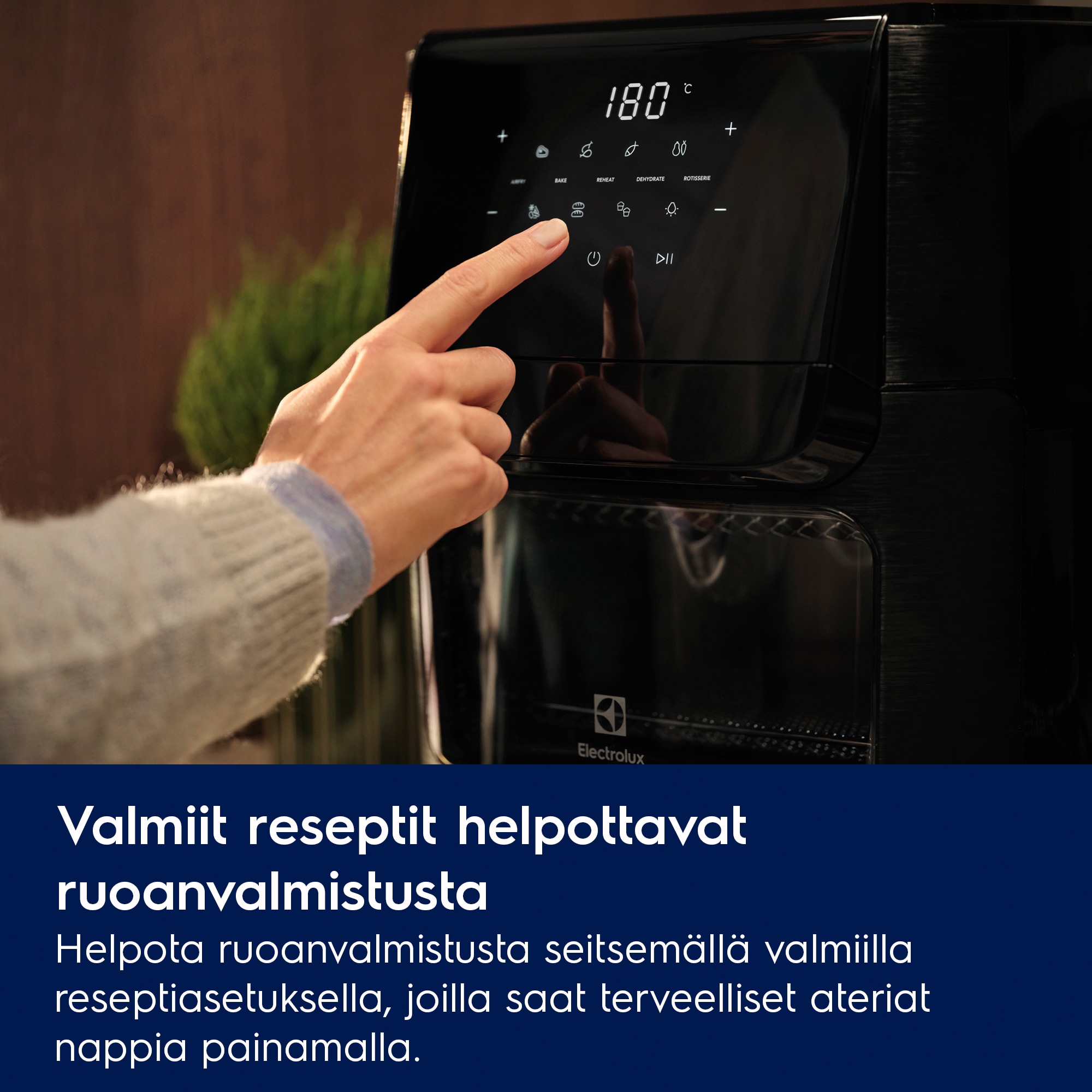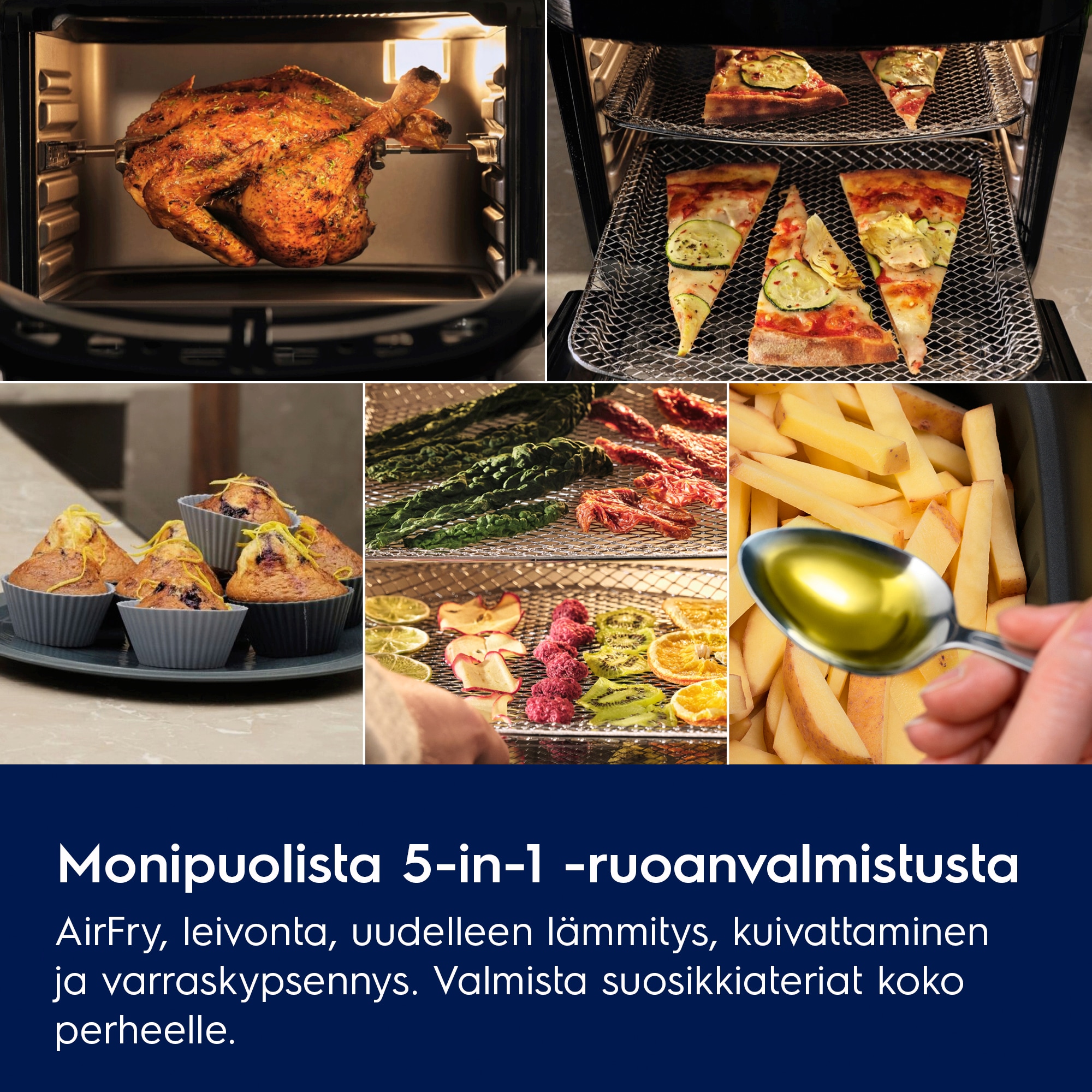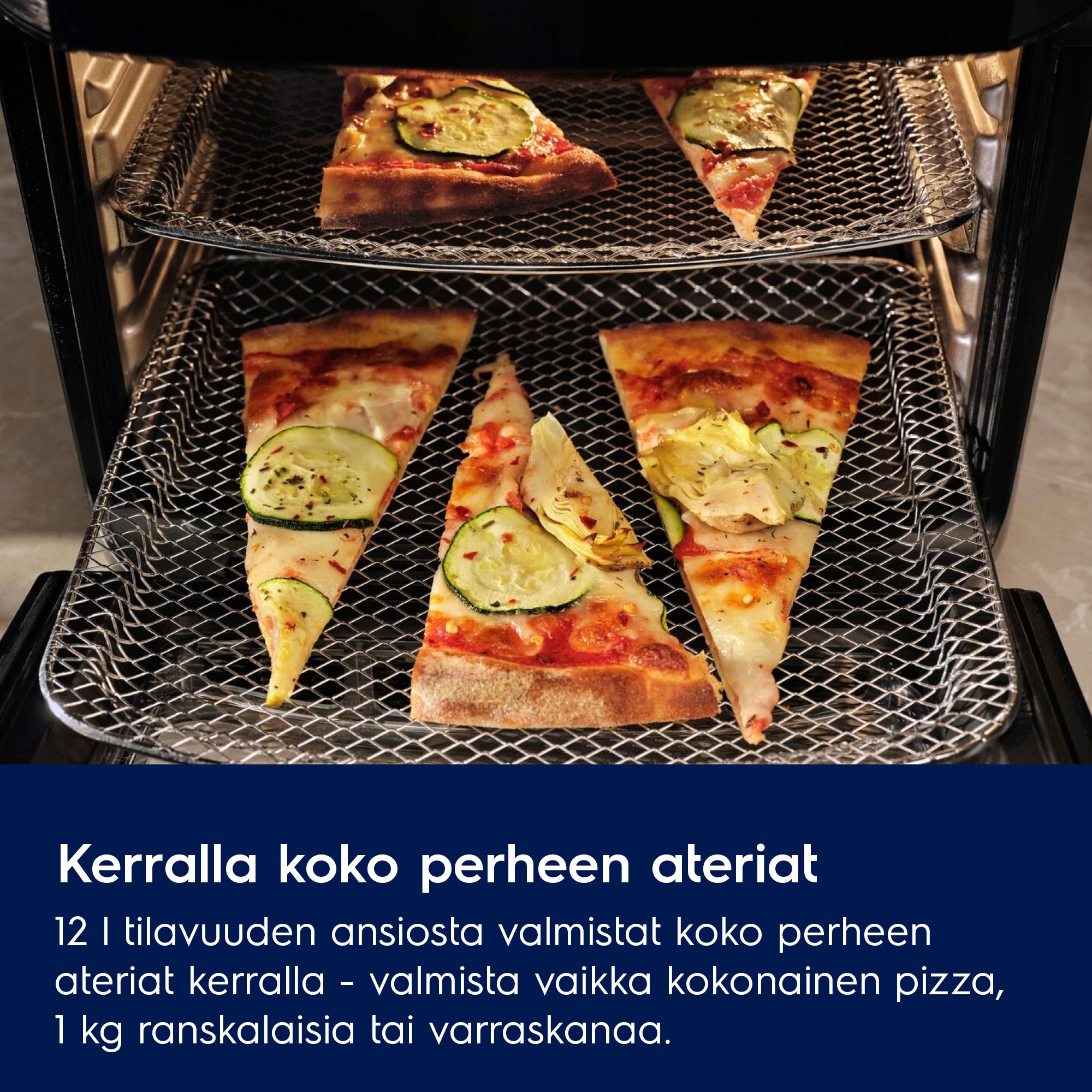 Ota kaikki ilo irti työtasolle asetettavan uunin viidestä kypsennystoiminnosta: airfry, paisto, uudelleen lämmitys, kuivaus ja grillaus, 12 litran tilavuus ruoan valmistamiseen koko perheelle. Lasiluukusta voit tarkistaa ruoan tilanteen ilman luukun avaamista.