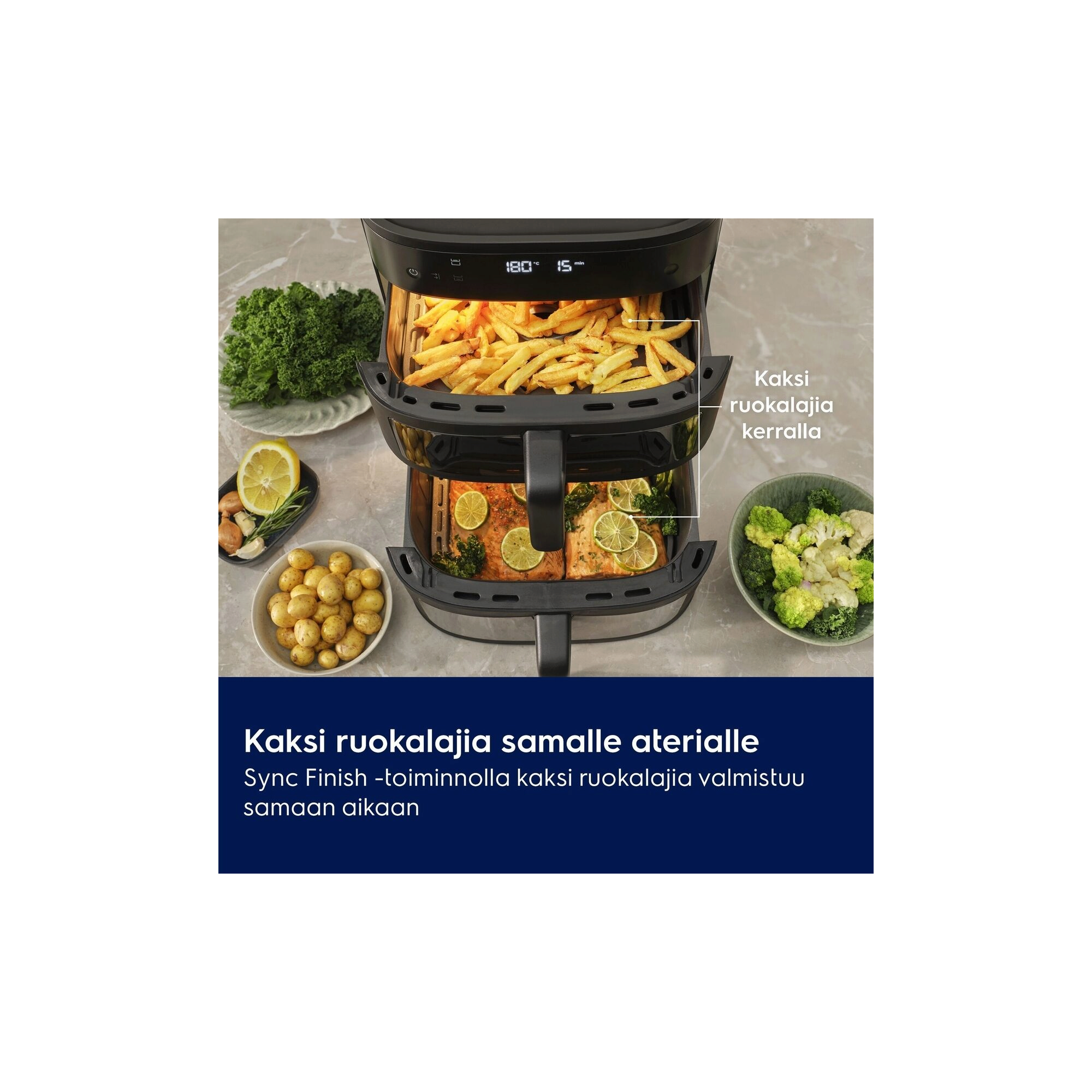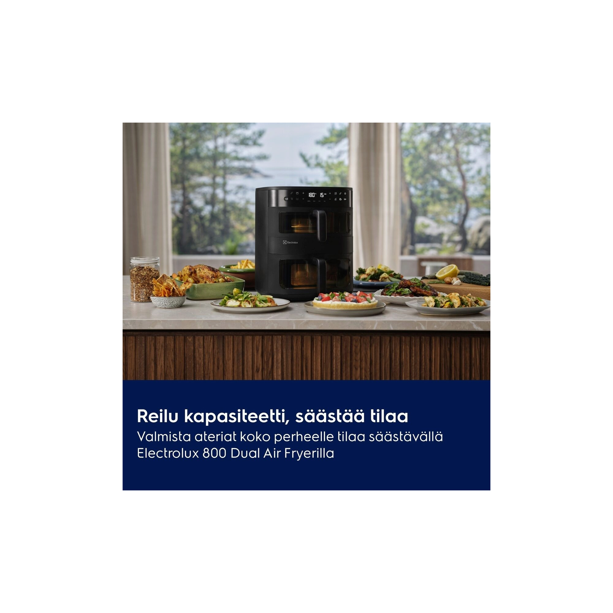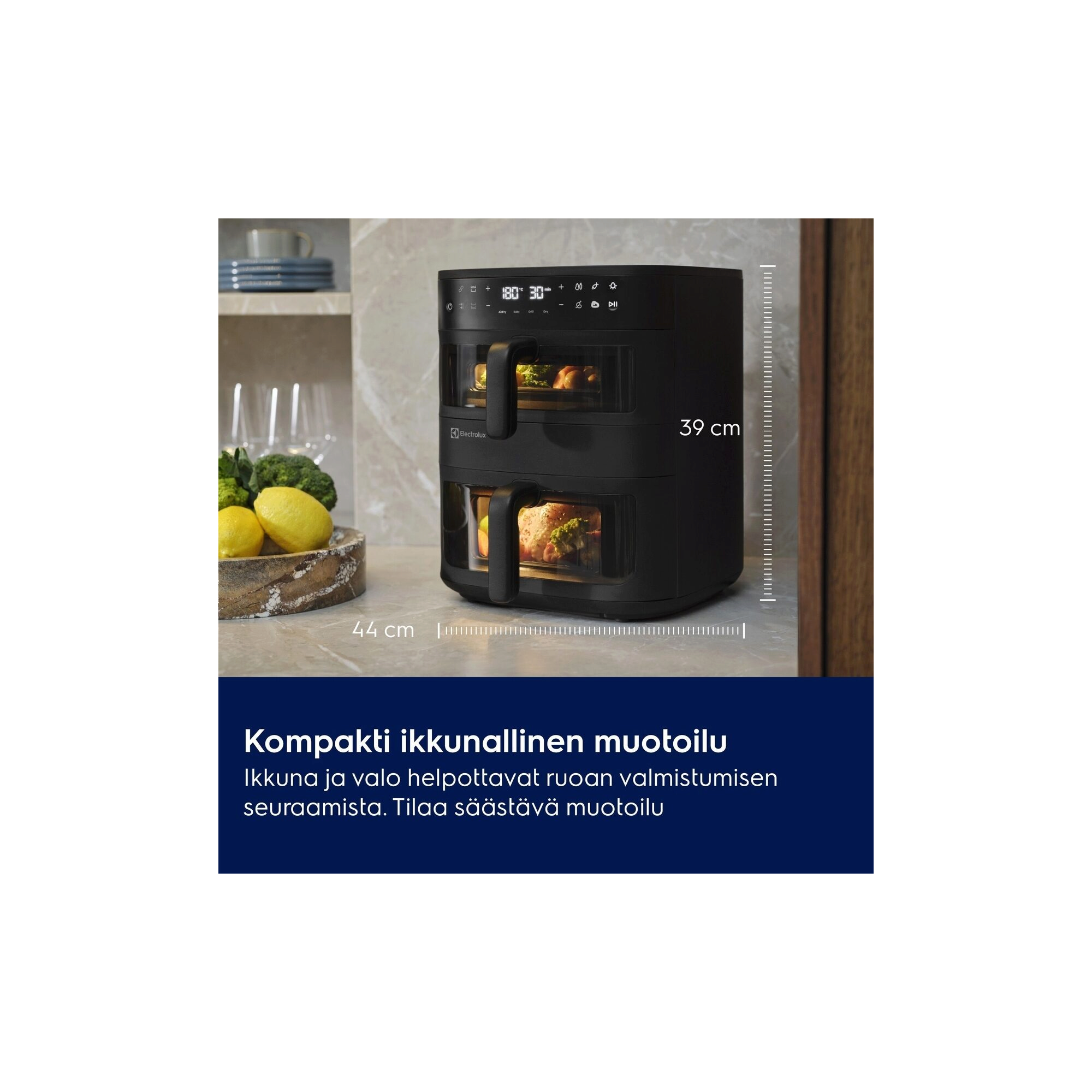 Electrolux 800 Dual Air Fryer sopii koko perheen aterioiden valmistukseen. Kaksi pystysuuntaista koria ja sisältä valaistut ikkunat helpottavat kahden ruokalajin tai yhden ison annoksen valmistumisen seuraamista.