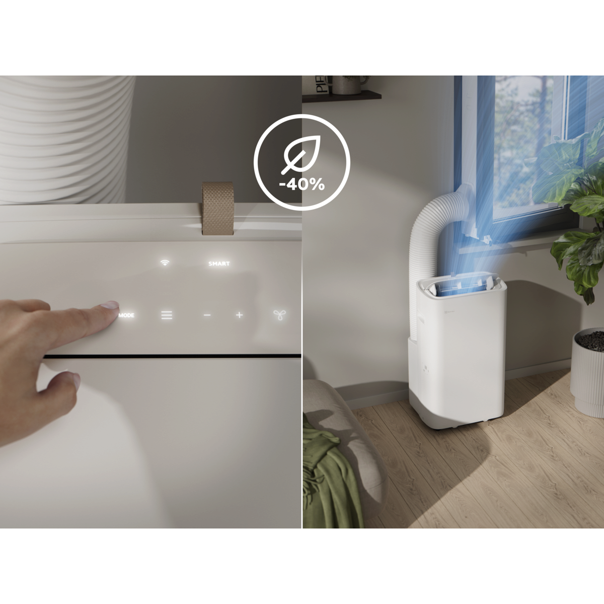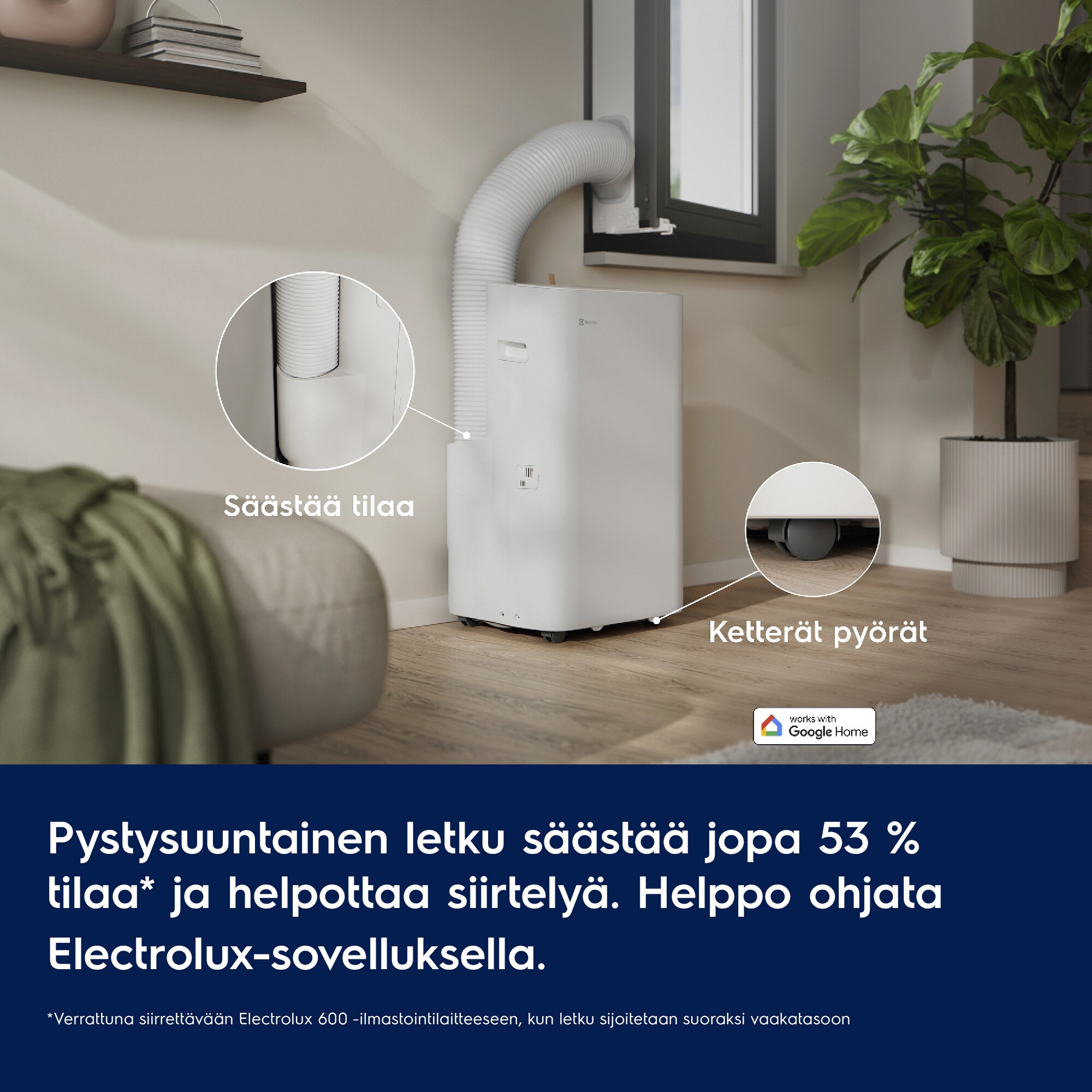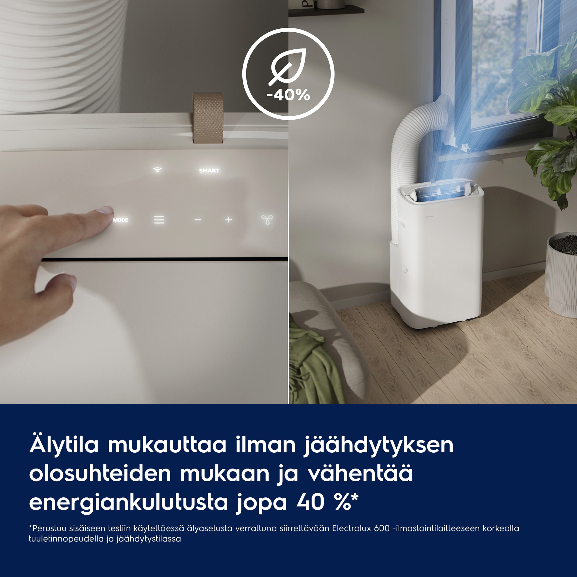 *Perustuu sisäiseen energiankulutustestiin älytilassa verrattuna siirrettävään, kiinteämoottoriseen Electrolux 600 -ilmastointilaitteeseen täydellä tuulettimen nopeudella. Lähtölämpötila 30 ℃ ja suhteellinen kosteus 45 %.