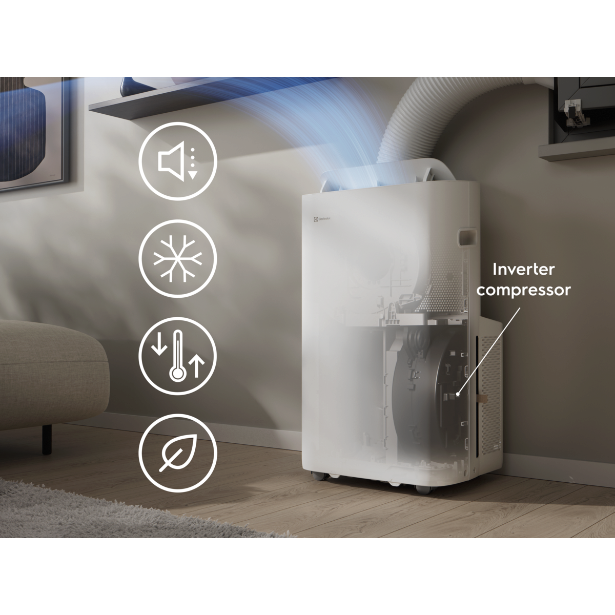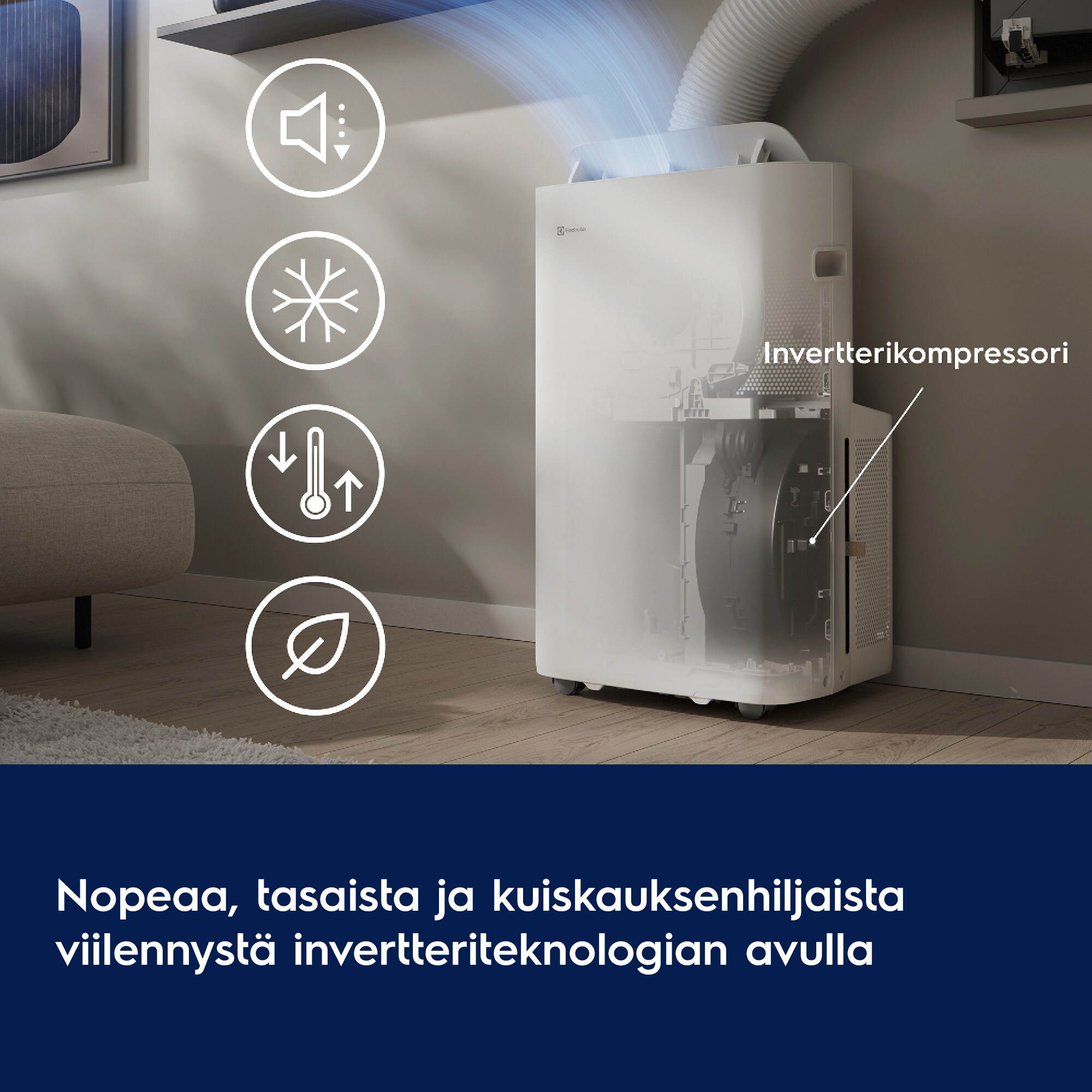 *Perustuu sisäiseen testiin, jossa vertailtiin invertterimoottorillista ilmastointilaitetta siirrettävään Electrolux 600 -ilmastointilaitteeseen perinteisellä moottorilla.