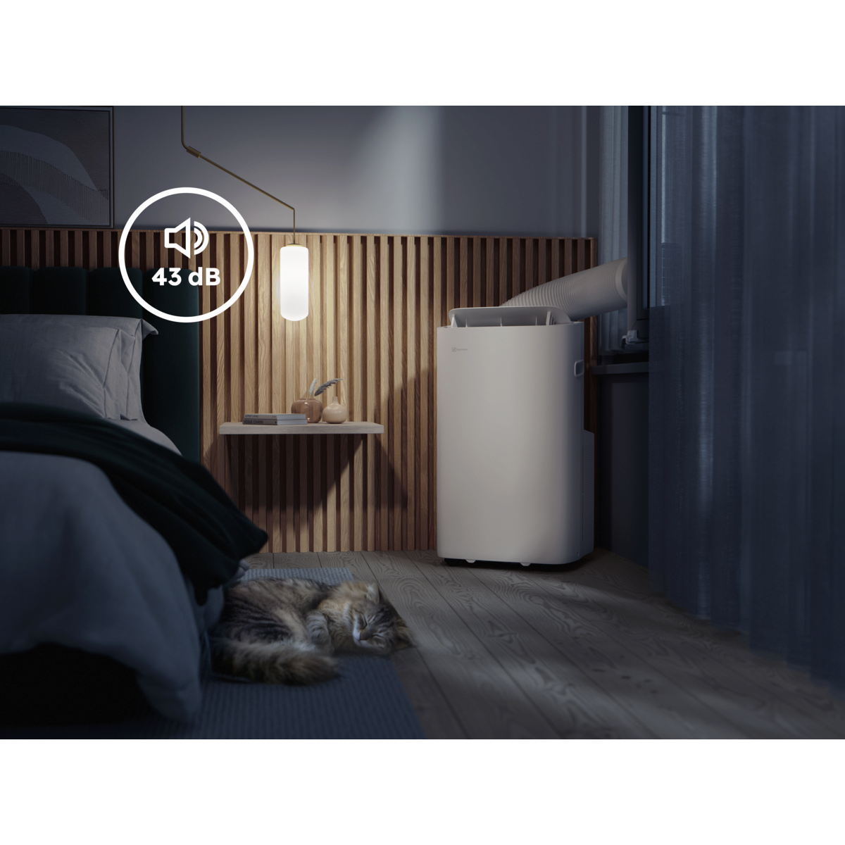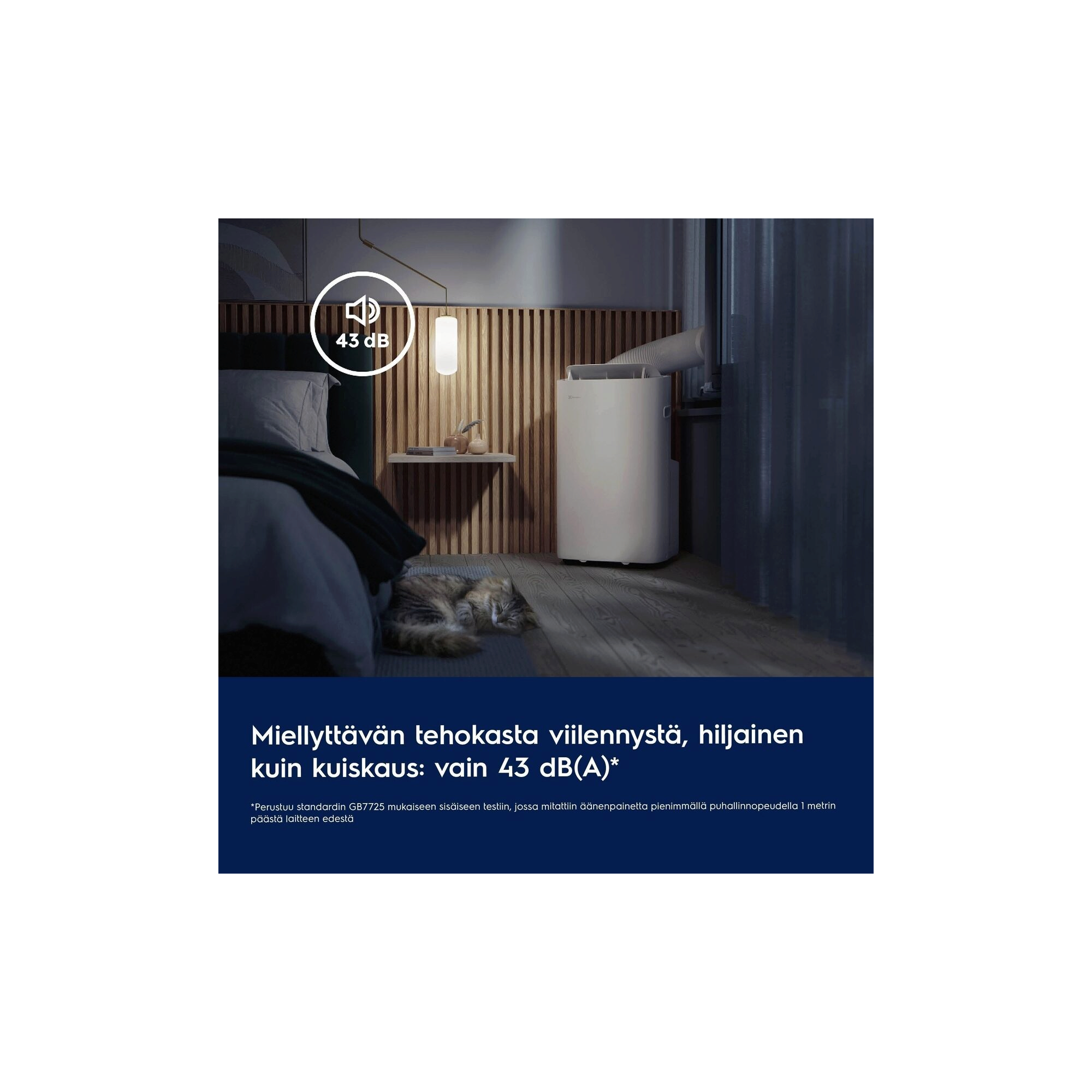 *Sisäinen testi, jossa äänenpaine mitattiin alhaisimmalla tuulettimen nopeudella yhden metrin etäisyydellä tuotteesta GB7725-standardin mukaan. Verrattuna monitoimisiin ilmastointilaitemalleihin Euroopan 30 suurimmalta siirrettävien ilmastointilaitteiden valmistajalta, hintahaarukka 400–900 €.