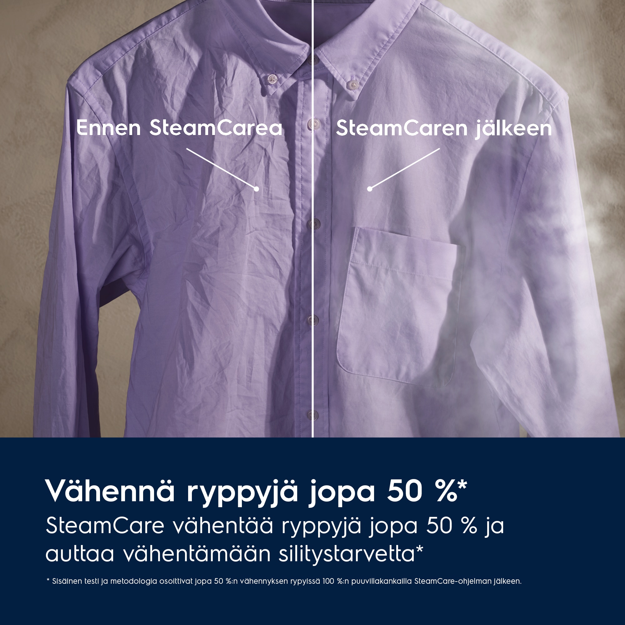 *Sisäisellä testaustavalla tehdyssä testissä todettiin ryppyjen vähentyneen jopa 50 prosenttia 100-prosenttisesta puuvillasta kudotussa kankaassa SteamCare-ohjelman käytön jälkeen.