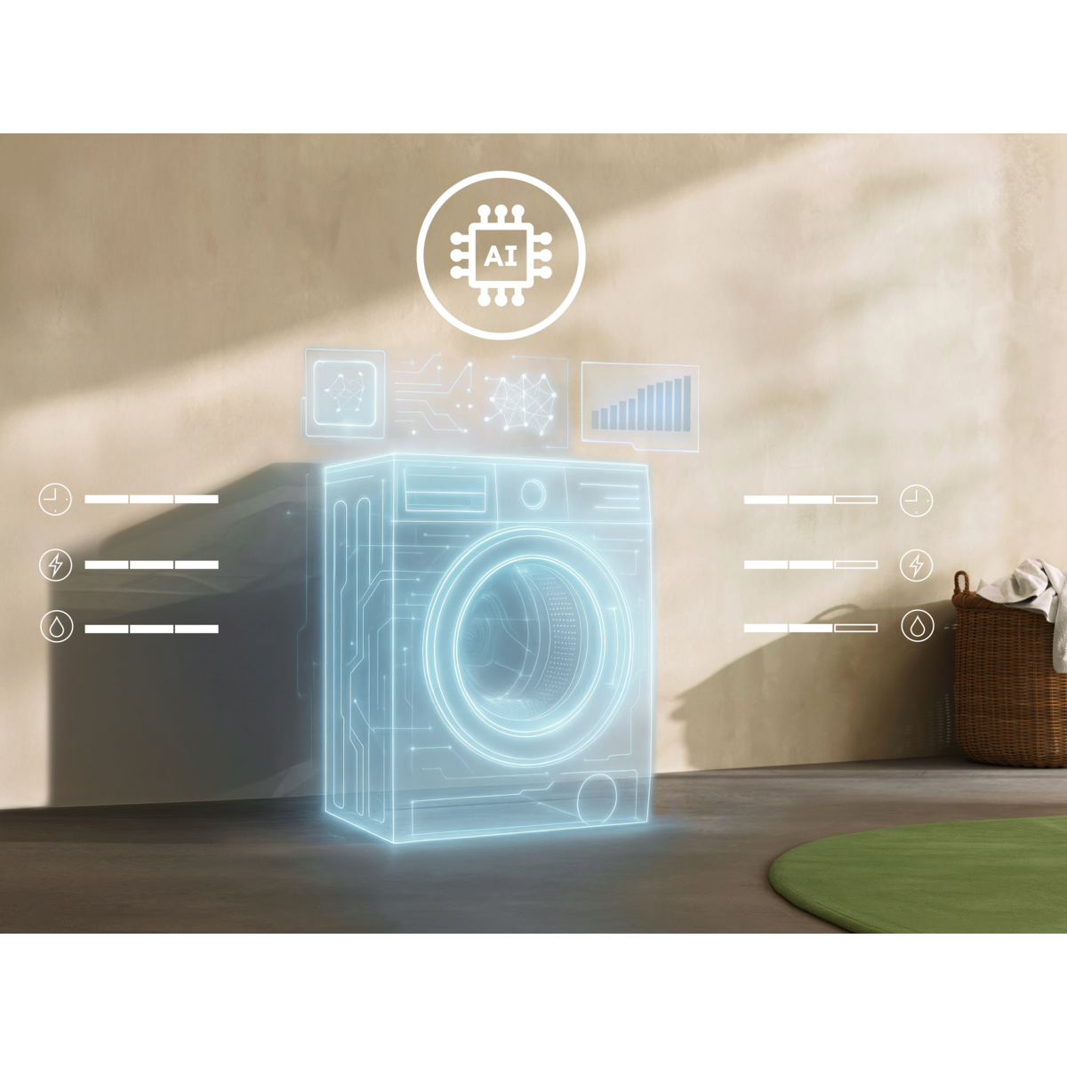 *Perustuu painontunnistusalgoritmiin, joka on koulutettu erilaisilla pyykkimäärillä. Tekoälyä ei jatkokouluteta käyttäjätiedoilla. **Sisäinen testi ajan-, veden- ja energiankulutuksesta 30 asteen puuvillaohjelmalla AI WashAssistin kanssa 1 kg:n pyykkimäärällä verrattuna maksimipyykkimäärään.