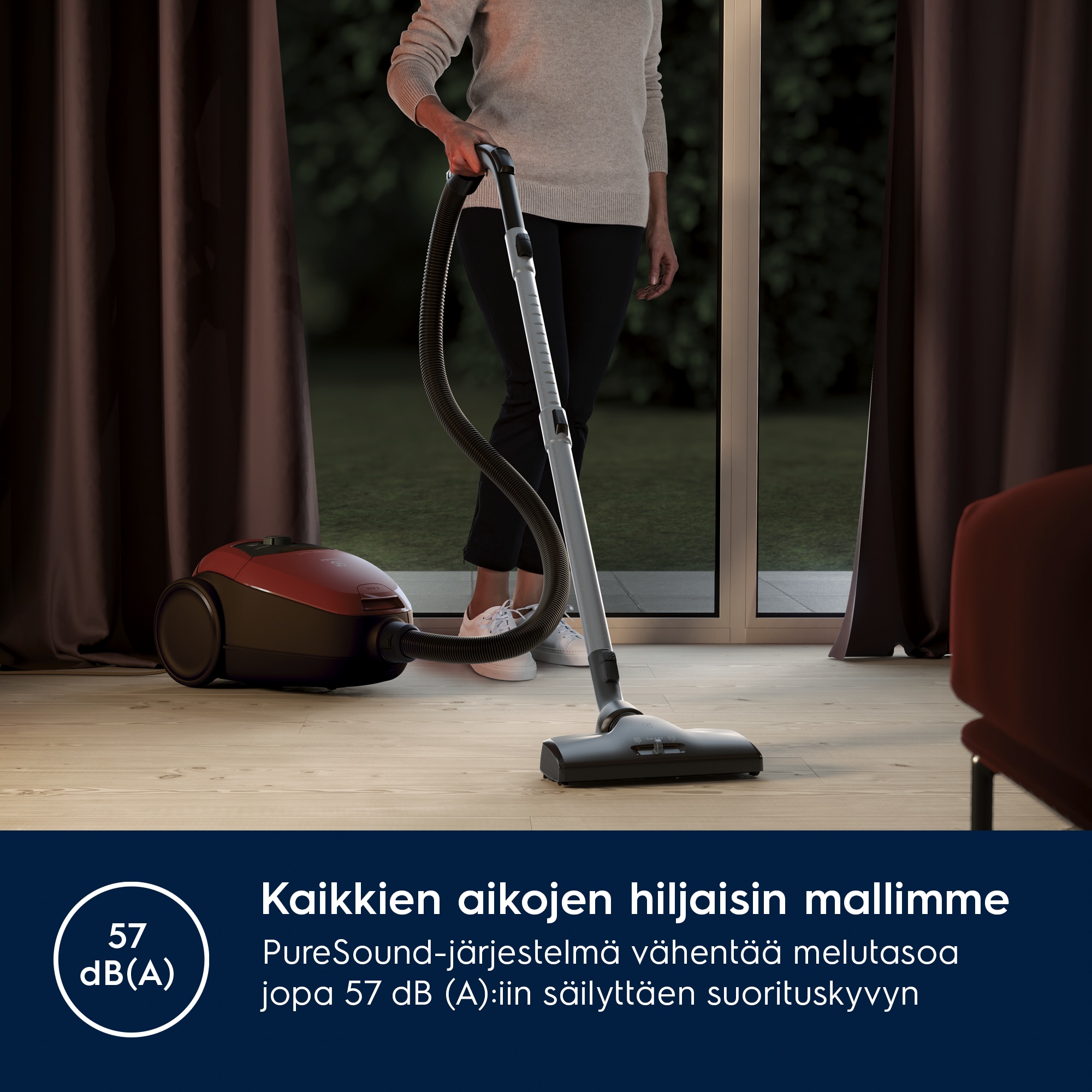 Meidän hiljaisin* pölynimuri. Äänitaso vain 57 dB(A).