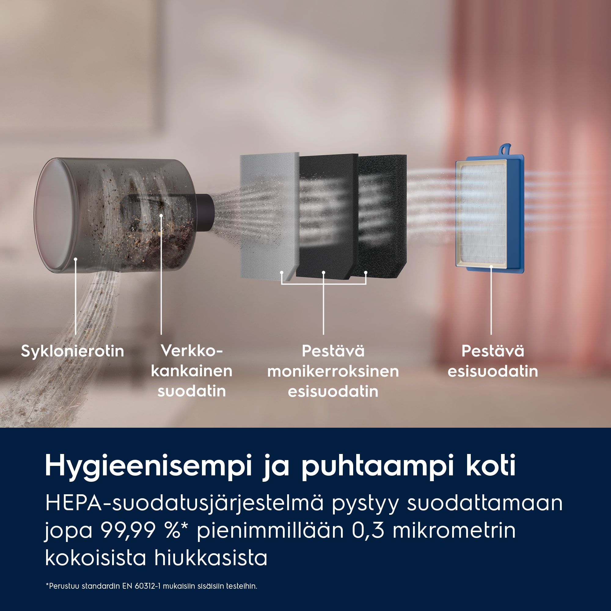 * Perustuu 0,3–10 mikrometrin kokoisten mikropölyhiukkasten suodatusta testaaviin standardin EN 60312-1 mukaisiin sisäisiin testeihin, joissa käytettiin standardinmukaisia hiekka-/pölyhiukkasia.