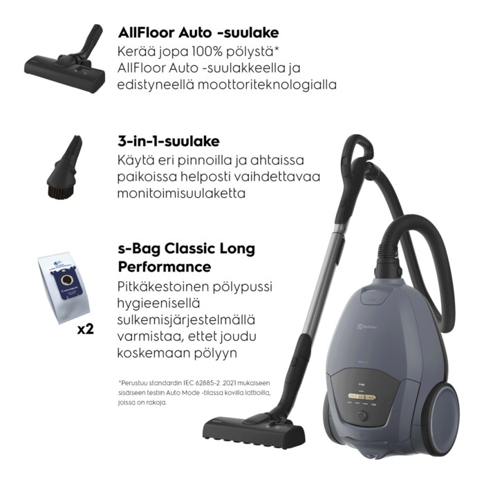 *Perustuu standardin IEC 62885-2 .2021 mukaiseen sisäiseen testiin Auto Mode -tilassa kovilla lattioilla.