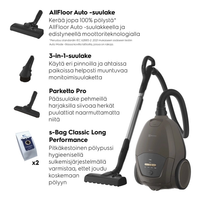*Perustuu standardin IEC 62885-2 .2021 mukaiseen sisäiseen testiin Auto Mode -tilassa kovilla, raollisilla lattioilla.